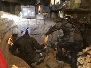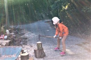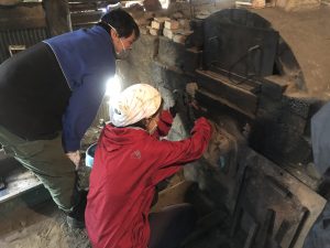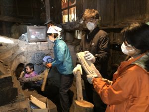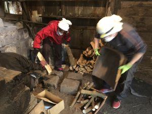 早速、炭焼き仕事の手伝いに入ります。以前に焼き上がっていた炭を取り出し、窯の清掃、新たな炭用木材の運搬と窯内に並べる作業、炭のカットと袋詰め、窯にくべるための薪割など、作業はたくさんあります。
