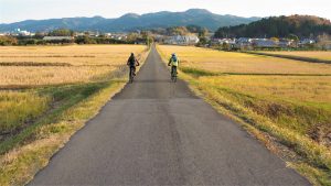里のMUJIみんなみの里を出発し、車通りがほとんどない田んぼの中の道を走ります。