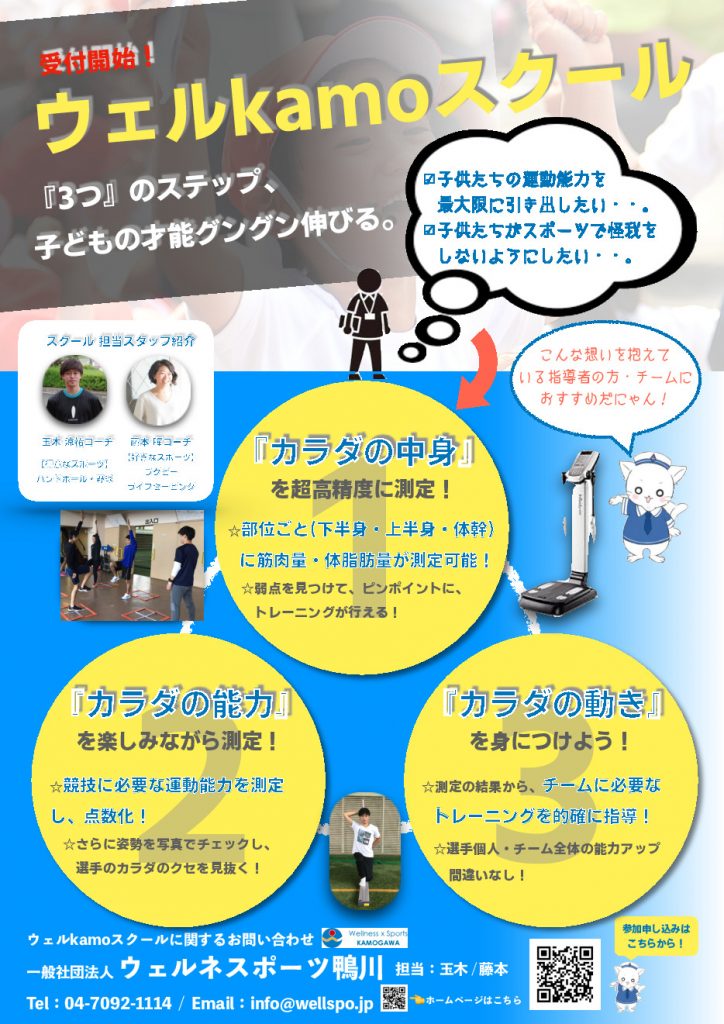 子どもの運動能力を最大限に引き出してあげたい。子どもがスポーツで怪我をしないようにしてあげたい。ウェルkamoスクールでは、運動能力テストと体成分分析によって子どもの特性を把握し、苦手の克服や有効なトレーニングを子ども本人や指導者の方にアドバイスします。