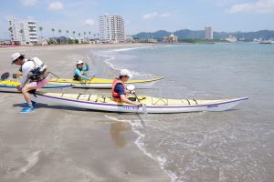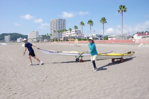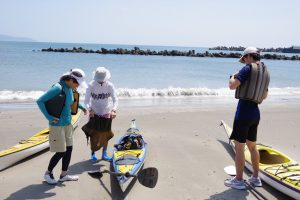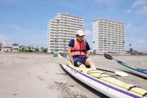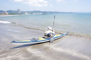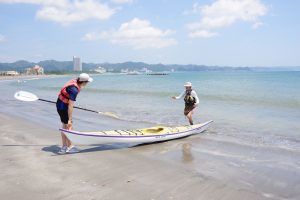 2人がかりで砂浜にカヤックを下ろして、1人で波打ち際までひっぱる。舗装路よりもタイヤが重くなって、ちょっと大変。でも、いい準備運動になった。