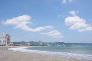 7~8分歩くと、広い砂浜に出る。鴨川で一番広い海岸「前原横渚海岸」。今日は素晴らしい天気だね!